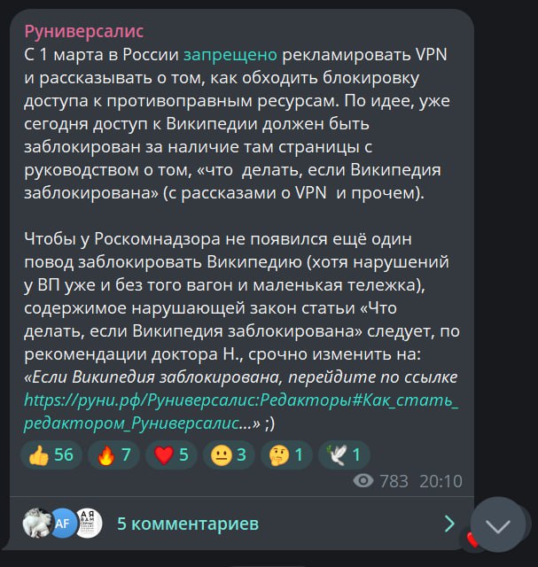 В телеграм-канале интернет-энциклопедии "Руниверсалис" 1 марта появился пост, в котором было сказано, что доступ к "Википедии" должен быть заблокирован "за наличие там страницы с руководством о том, «что делать, если Википедия заблокирована» (с рассказами о VPN и прочем)".